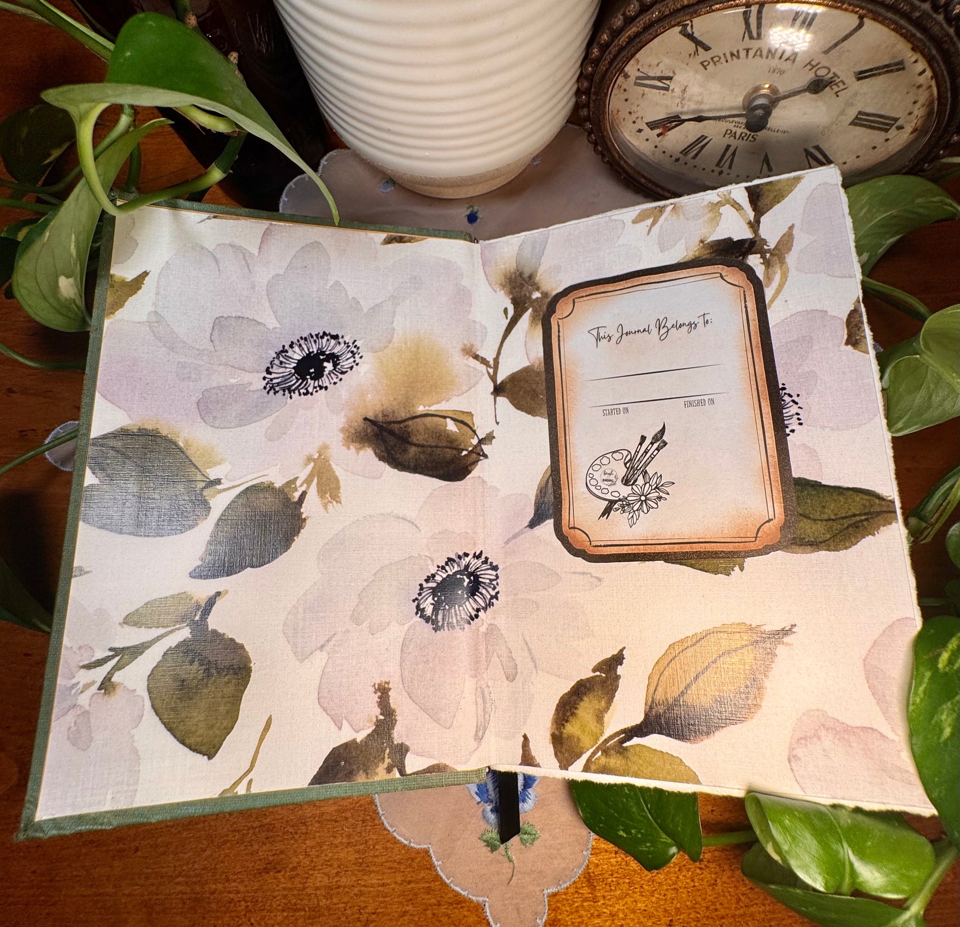 Pages are framed by Emma Lefebvre’s dreamy florals on textured cardstock – printed inside both covers, greeting your brush with beauty.