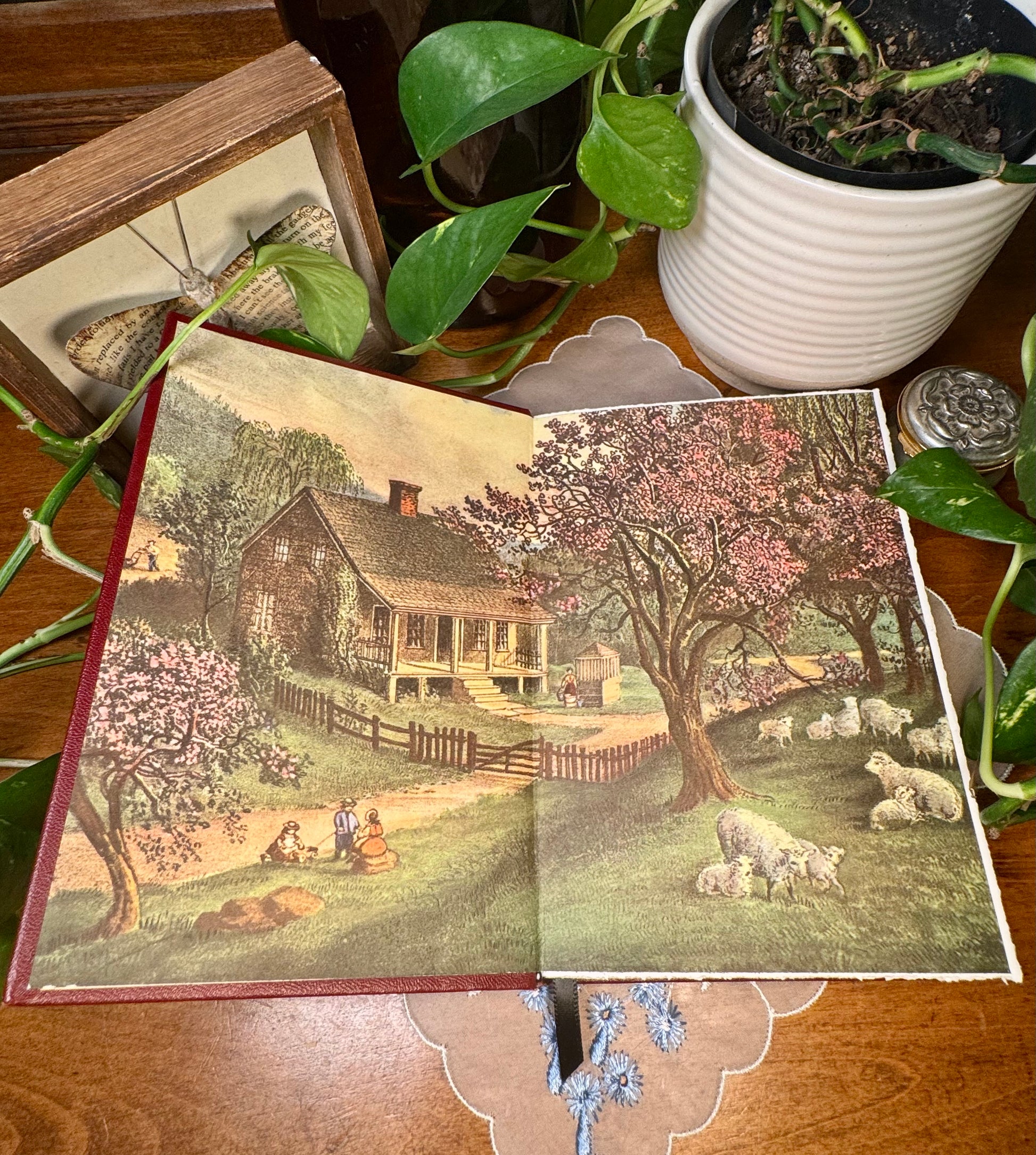 A timeless print from ‘Currier and Ives’ America’ (1952) graces the front – an original illustration from the late 1800s, full of charm, character, and old-world detail. Titled ‘American Homestead: Spring’.
