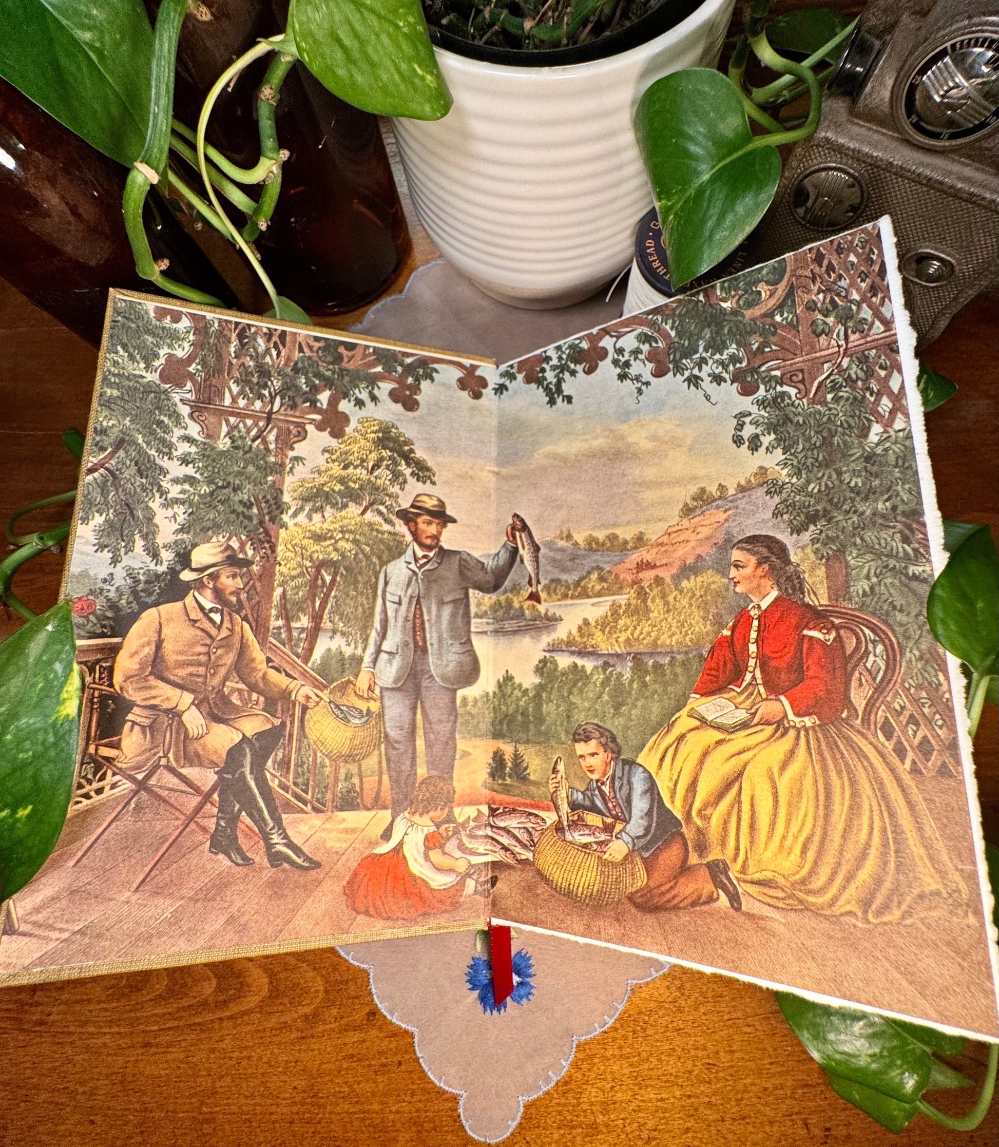 A timeless print from ‘Currier and Ives’ America’ (1952) graces the front – an original illustration from the late 1800s, full of charm, character, and old-world detail. Titled ‘Home from the Brook: The Lucky Fisherman’.