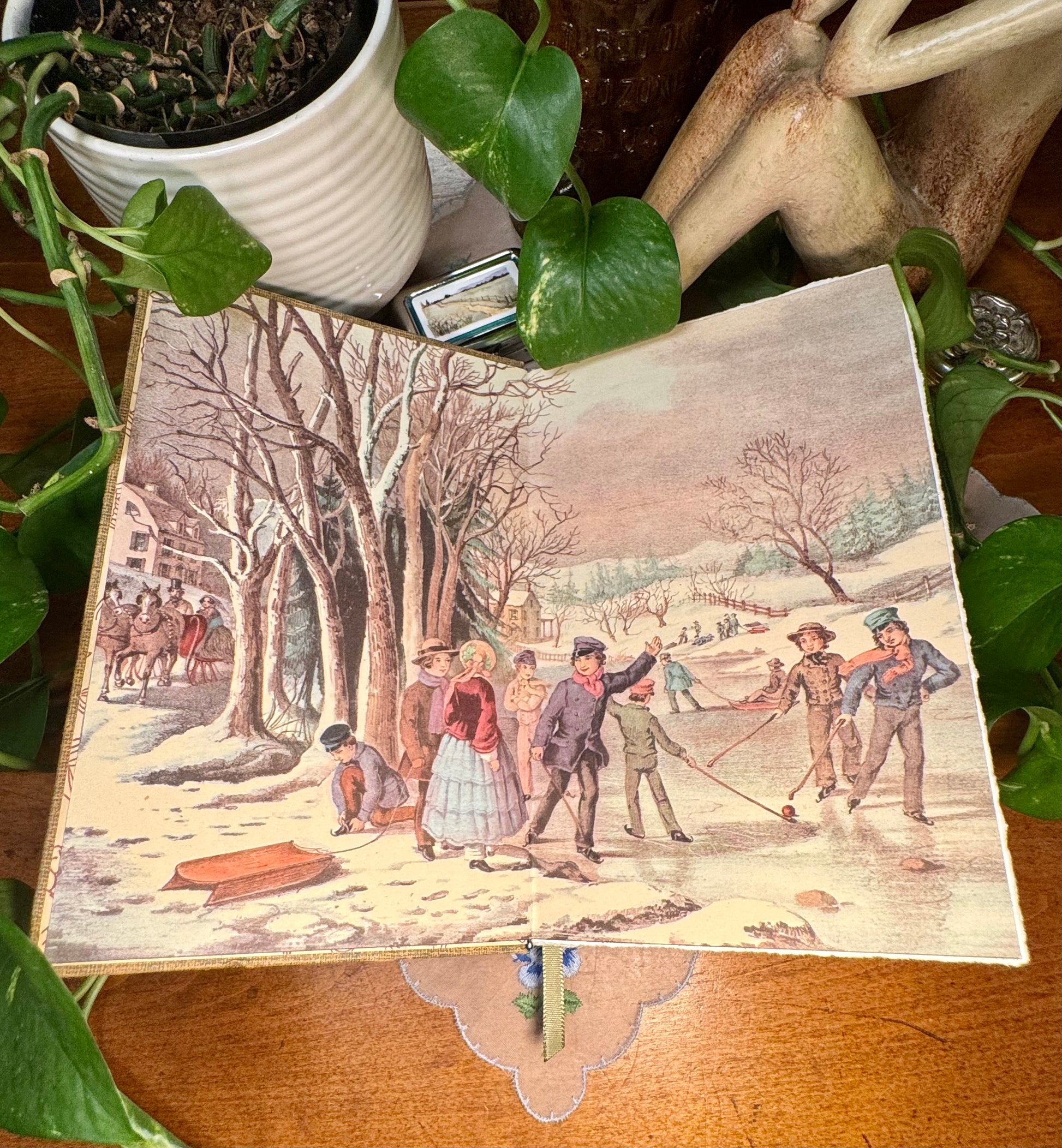Inside the front cover, you'll find an original Currier & Ives print pulled from the 1952 edition of ‘Currier and Ives’ America’ – originally illustrated in the late 1800s. A little glimpse into the past, titled ‘Winter Pastime’.